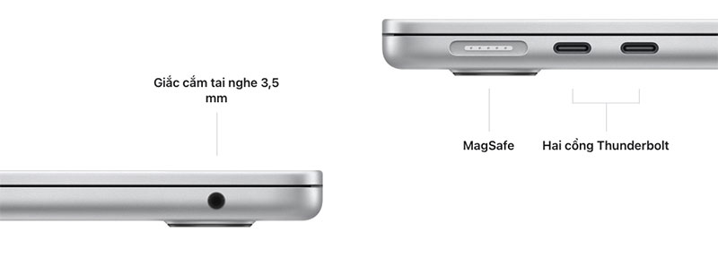 Cổng MagSafe hỗ trợ sạc nhanh, hai cổng Thunderbolt kết nối tốc độ cao và jack tai nghe 3.5mm. Ổ SSD dung lượng lớn cho phép lưu trữ và truy cập dữ liệu nhanh chóng.